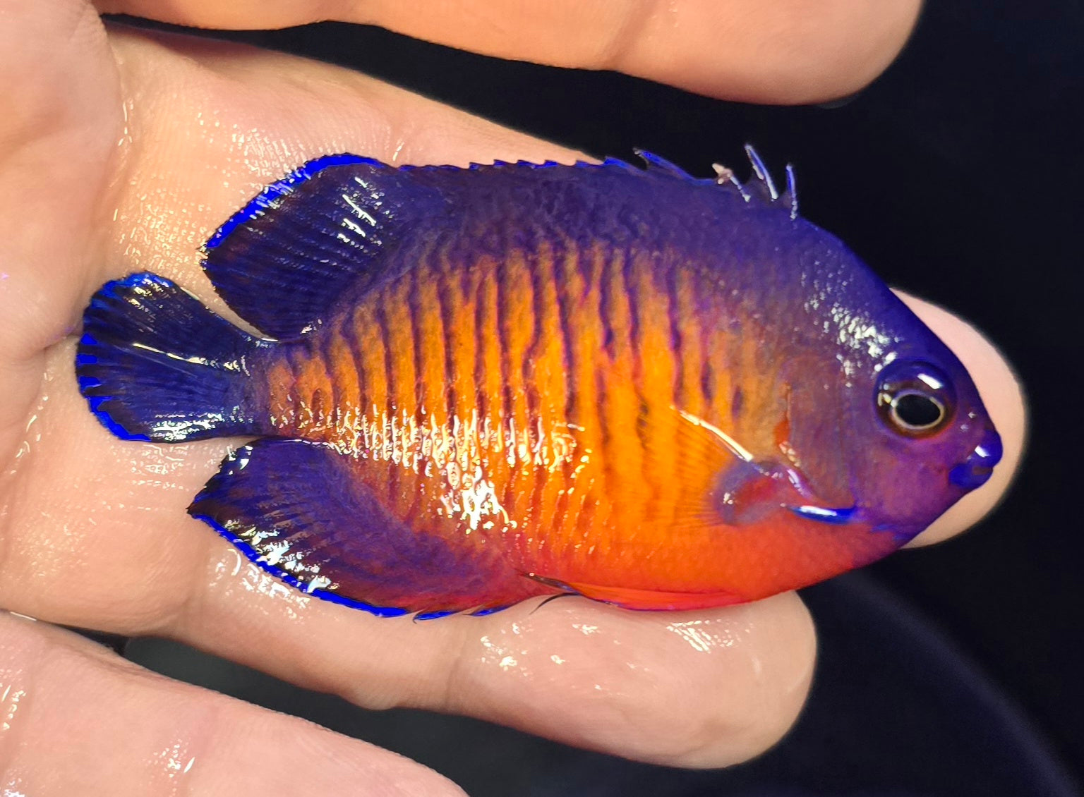 Color: Orange body with blue/purple stripes, blue/purple head and fins.