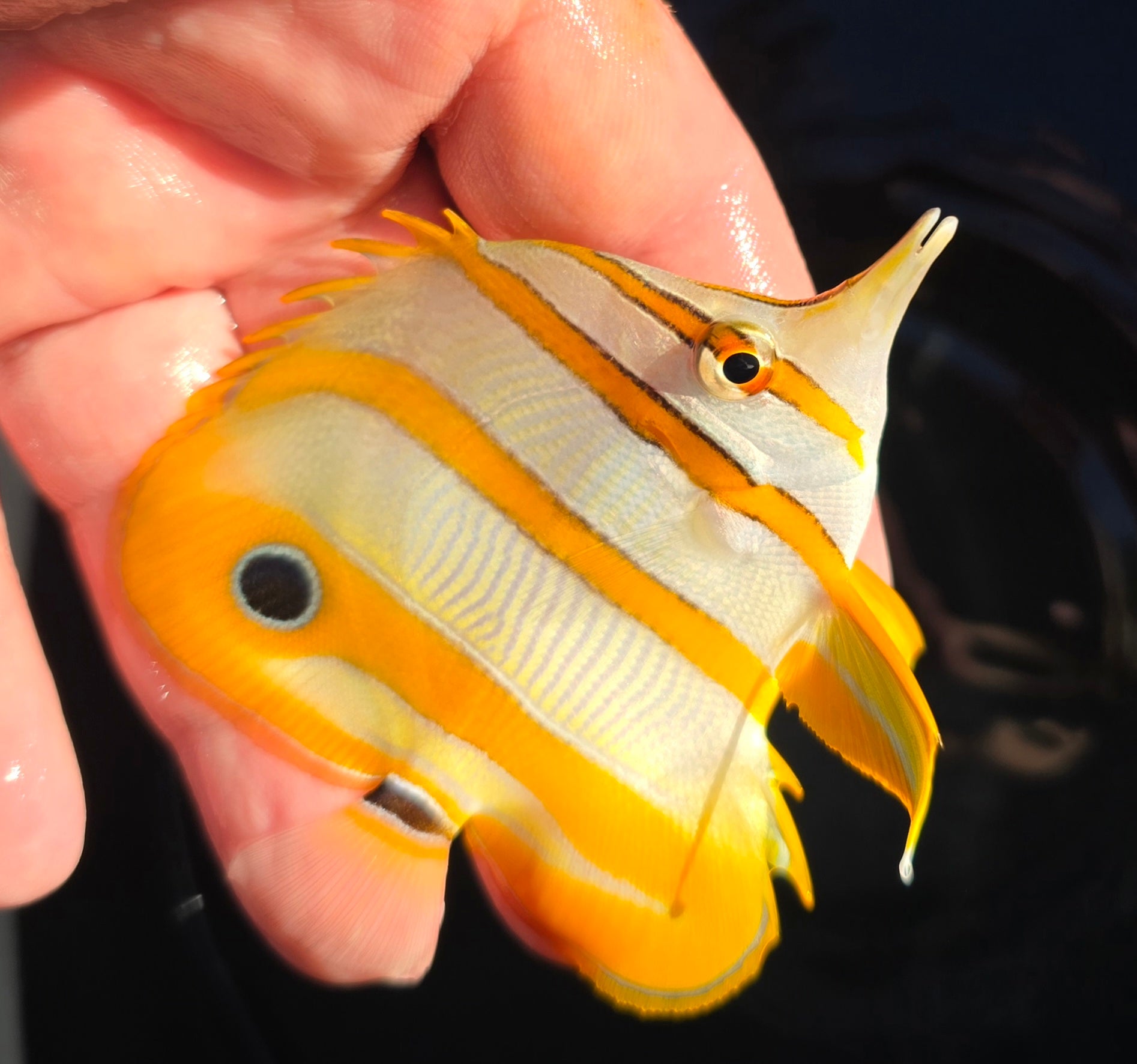 These fish are easily identified by the yellow banding and long snout. The young fish are similar in appearance to adult fish. Butterflyfish grow up to 20 cm in length.The fish appears taller than its length because of its compressed, deep-bodied form with a long dorsal and posterior fins as well as its vertical yellow stripes on a white background. The snout is long and slender, and the dark eye of the fish is less conspicuous than the dark eye-spot on the dorsal fin. The base of the tail features a dark band that runs perpendicular to the tail. Butterflyfish may be distinguished from the similar C. marginalis by their color pattern and number of dorsal fin rays.