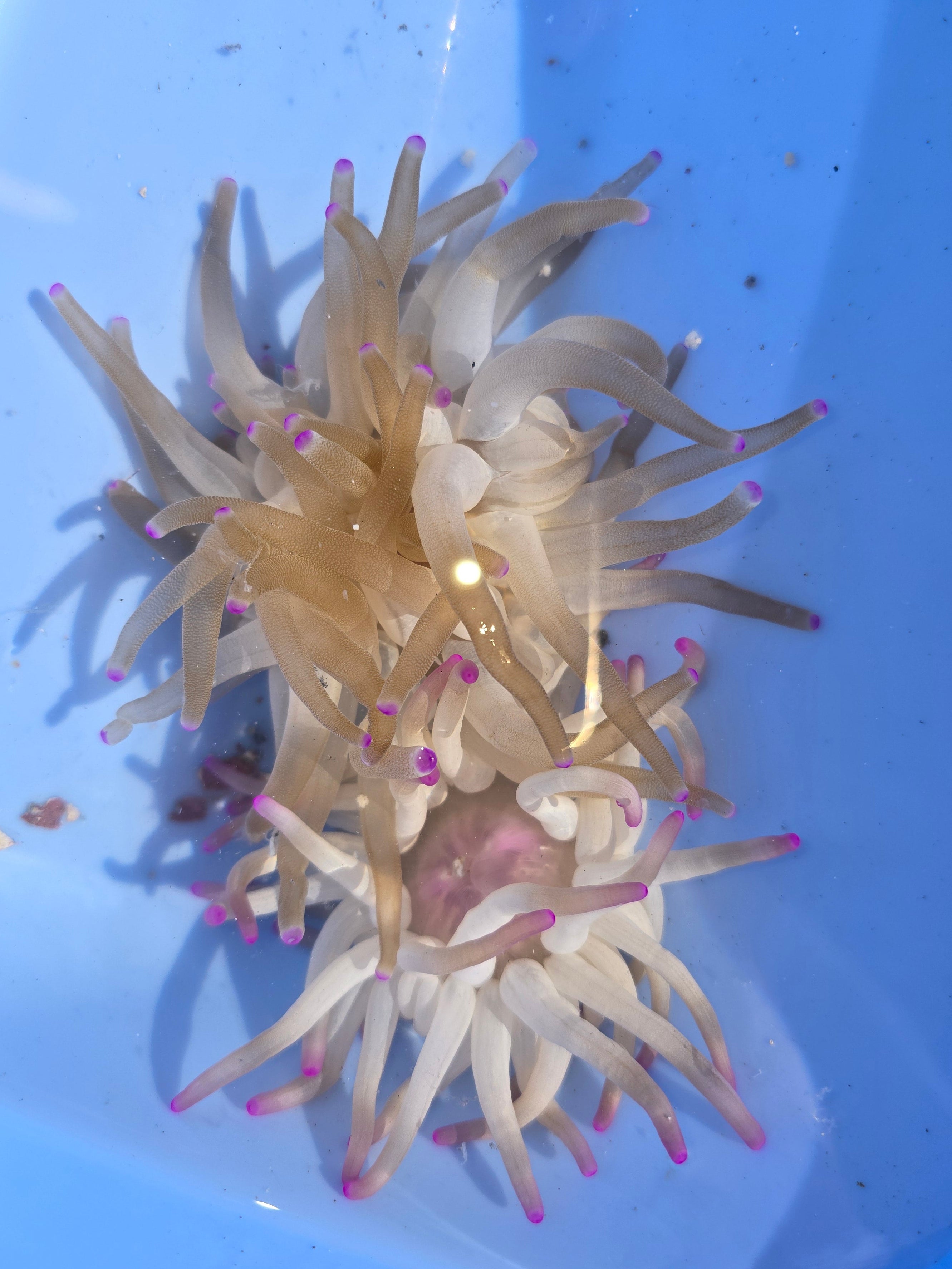 Condylactis gigantea, also known as the Giant Caribbean Sea Anemone or Atlantic Anemone, is a large, columnar anemone found in shallow waters of the Caribbean Sea and western Atlantic Ocean. These anemones can be white, light blue, pink, orange, pale red, or light brown, with numerous tentacles, each often having a pink, scarlet, blue, or green-ringed tip. They can grow to be over 30 cm in diameter.